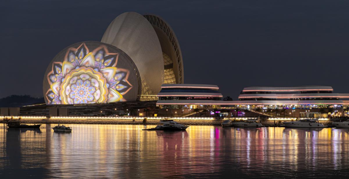 燈光投影項(xiàng)目以珠海大劇院外墻為“幕布” ,周邊安裝有34臺(tái)32000流明Barco激光投影、1114盞泛光燈、圖形燈及電腦燈,于2019年11月投入使用,2021年2月正式啟動(dòng)商業(yè)運(yùn)作,是中國(guó)唯一的海島地標(biāo)媒體。