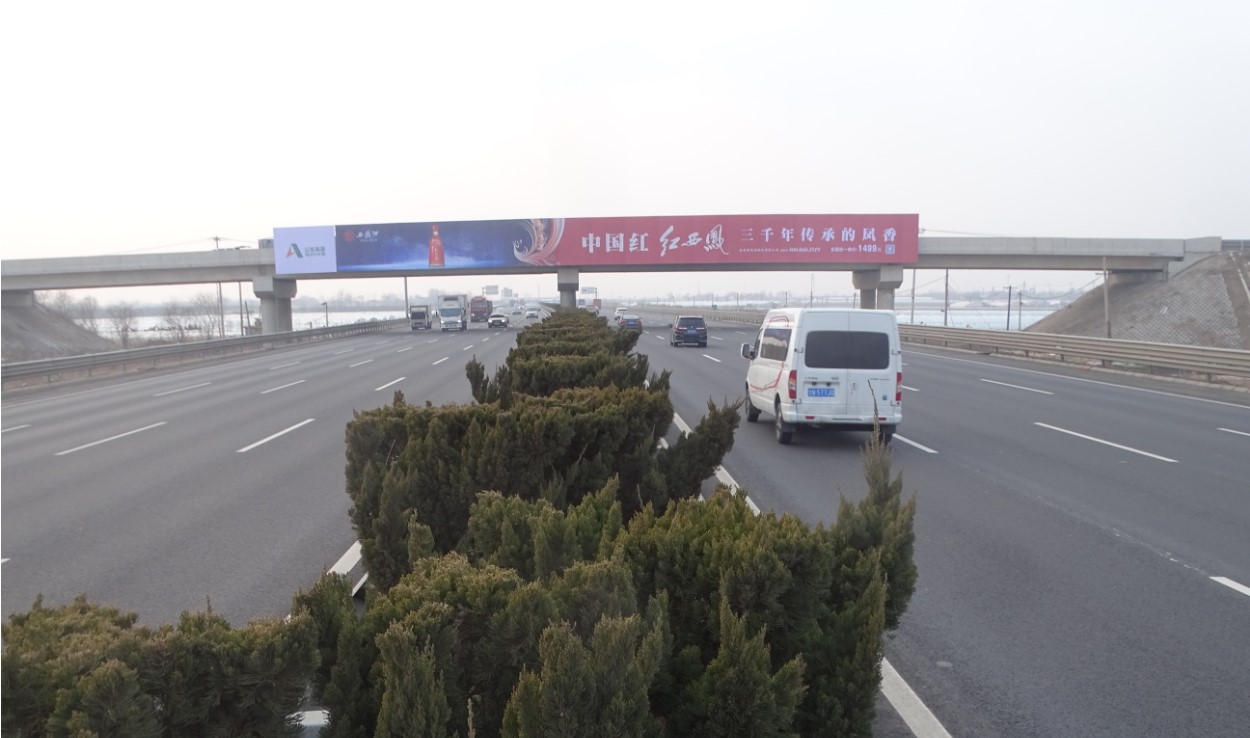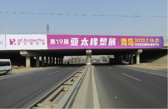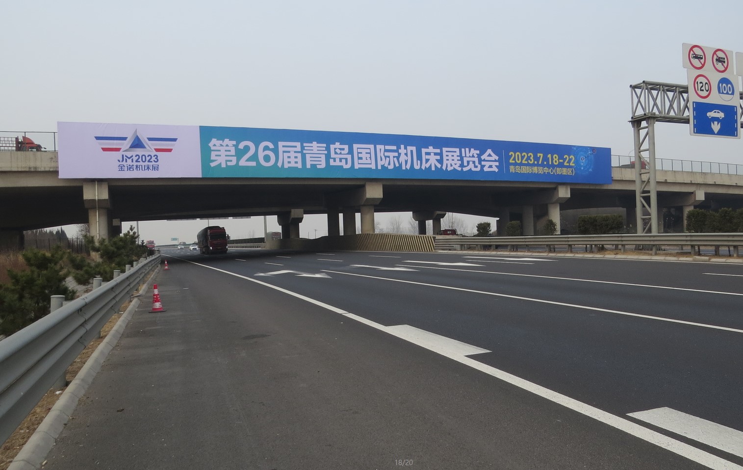 媒體形式:噴繪廣告(LED燈照明)河套樞紐S397省道橋體(機場通往青島市區(qū)方向);