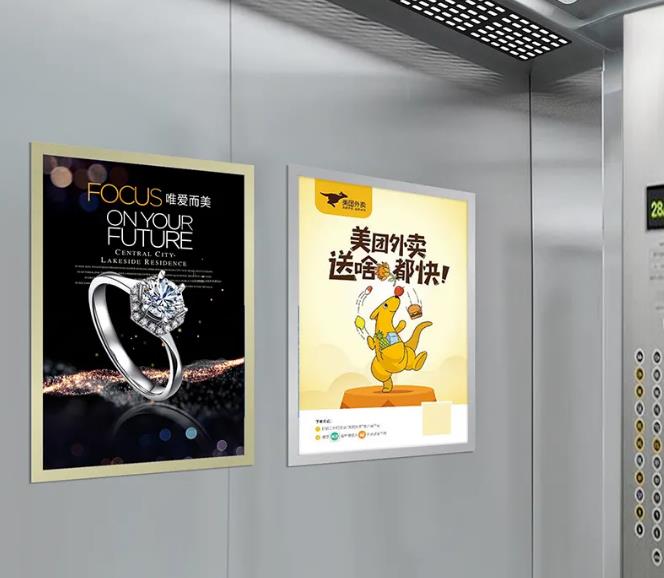 電梯框架廣告是指電梯轎廂內(nèi)的廣告框,一般用來安裝廣告海報,起到廣告作用。電梯廣告框架是生活中最常見的電梯廣告類型,也最為普遍的類型,通常在商場、小區(qū)電梯內(nèi)是常常可以看見的一種廣告方式。在投放此類廣告商一定要在海報設計上富有創(chuàng)意,采用多圖少字的設計,信息量充足,這樣才能達到傳播的效果。