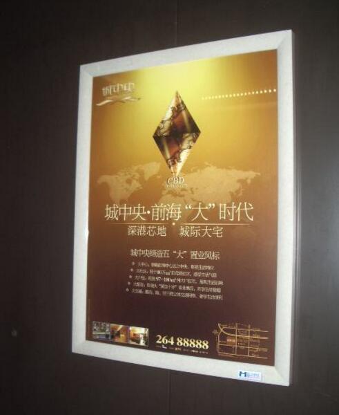 電梯框架廣告為靜態(tài)直至畫面, 24小時不間斷播出一個廣告畫面、由于電梯轎廂內(nèi)是封閉的環(huán)境、廣告到達(dá)率比較高、樓盤覆蓋一般社區(qū)為主、寫字樓為輔。