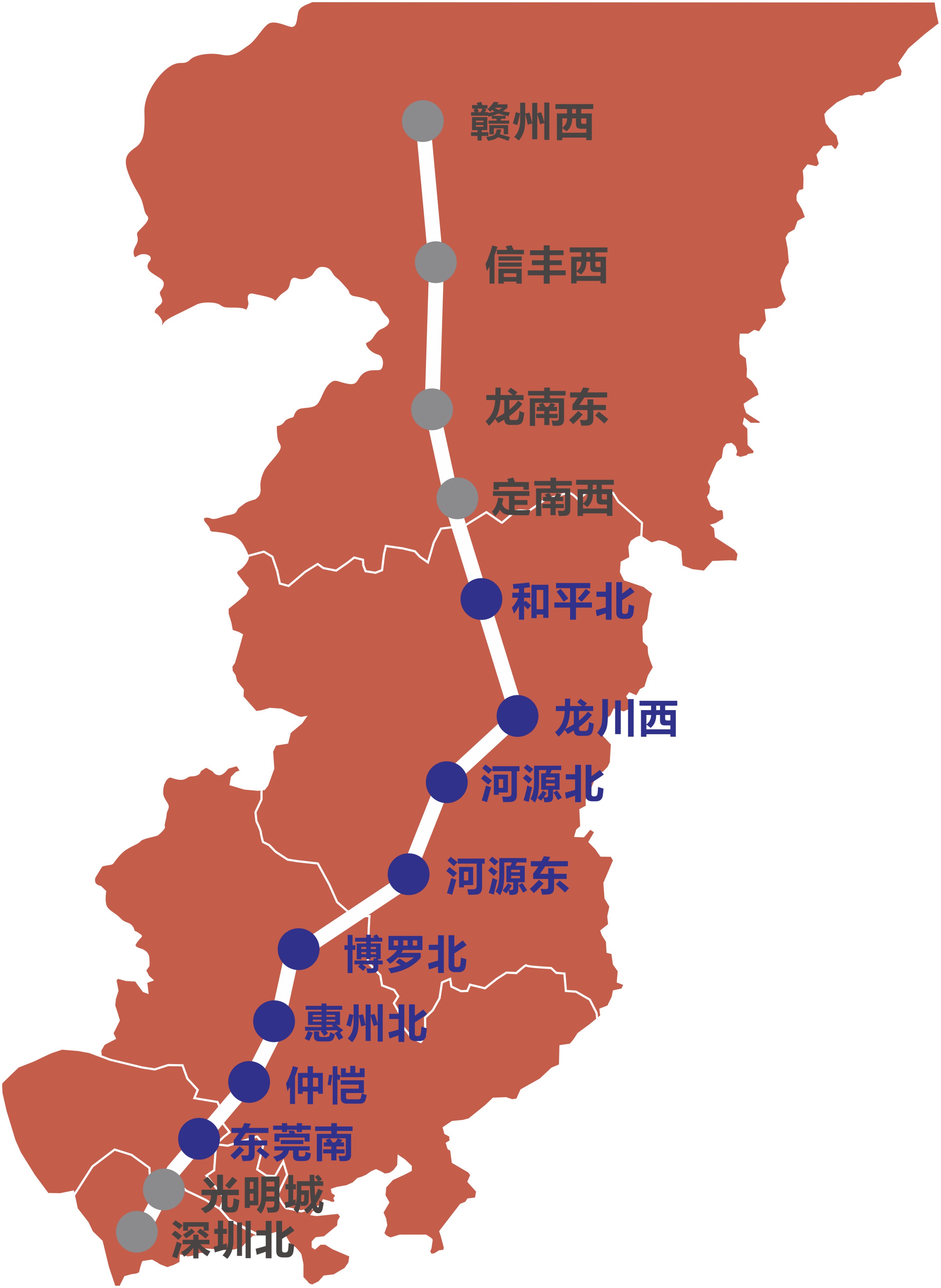 贛深高速鐵路全線共設(shè)14個車站,該線路北起江西省贛州市,南抵廣東省深圳市。