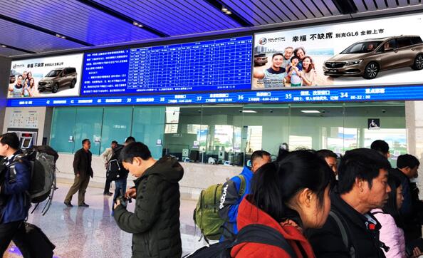 | 重慶西高鐵站候車廳LED信息屏兩側(cè) 廣告尺寸(m)寬*高:8.32*5*1面=41.6平方 媒體數(shù)量:8 最少購買數(shù)量:1 刊例價(萬元/月/塊):60/塊 |