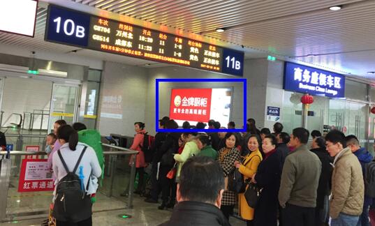 | 重慶北高鐵站候車大廳10B-11B檢票口廣告 嵌入式燈箱 廣告尺寸(m)寬*高:3.99*1.79*1面=7.14平方 媒體數(shù)量:2 最少購買數(shù)量:1 刊例價(萬元/月/塊):6/塊 |