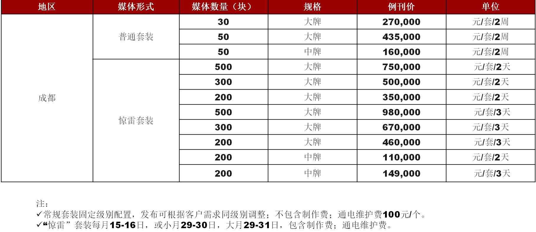 | 成都主城區(qū) 2018年度新一線城市 覆蓋成都中心城區(qū)80%以上點(diǎn)位 1200塊燈箱 人民南路、蜀都大道、順城大道、長(zhǎng)順街、二環(huán)路、 益州大道、青羊大道、東大街、蓉都大道……春熙路、天府廣場(chǎng)、鹽市口、總府路…… 成都-金堂縣 成都東進(jìn)戰(zhàn)略主戰(zhàn)場(chǎng) 230塊燈箱 迎賓大道、十里大道、成金大道、濱江路、萬(wàn)達(dá)商圈、大學(xué)城…… ? |