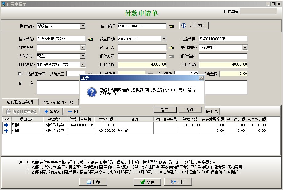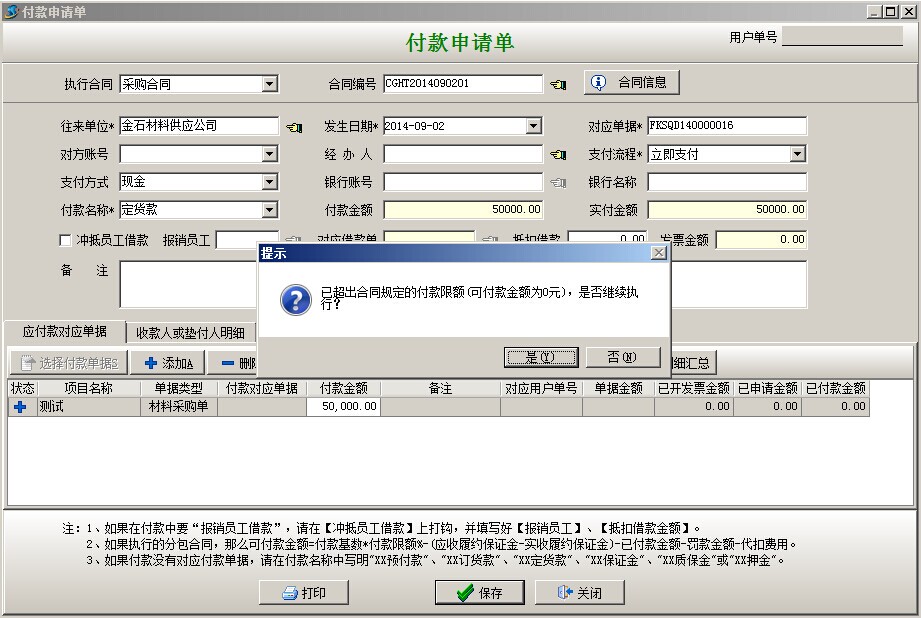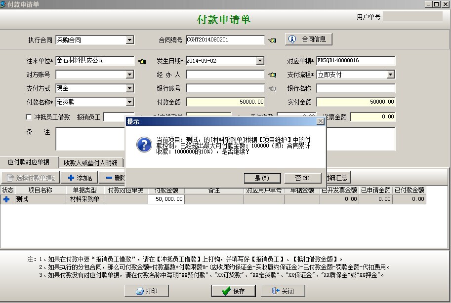 彈出付款申請單,付款名稱自動(dòng)默認(rèn)材料設(shè)備款+預(yù)付款,付款明細(xì)是自動(dòng)帶入的,選擇支付方式點(diǎn)保存,會(huì)出現(xiàn)提示窗口根據(jù)下面截圖進(jìn)行選擇繼續(xù)。