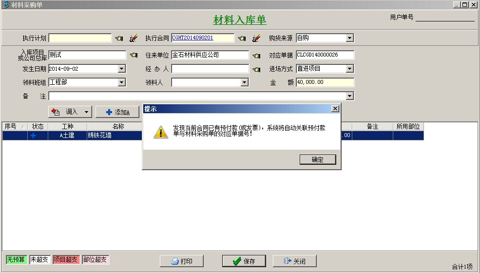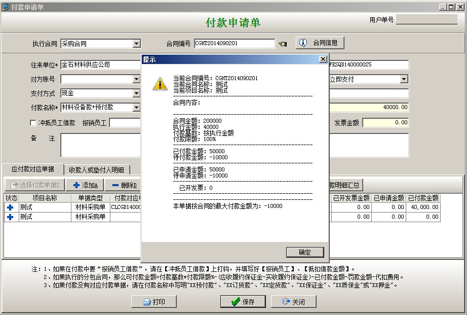 備注:上圖提示為預(yù)防超額付款的合同明細(xì)提示,點(diǎn)確定即可。