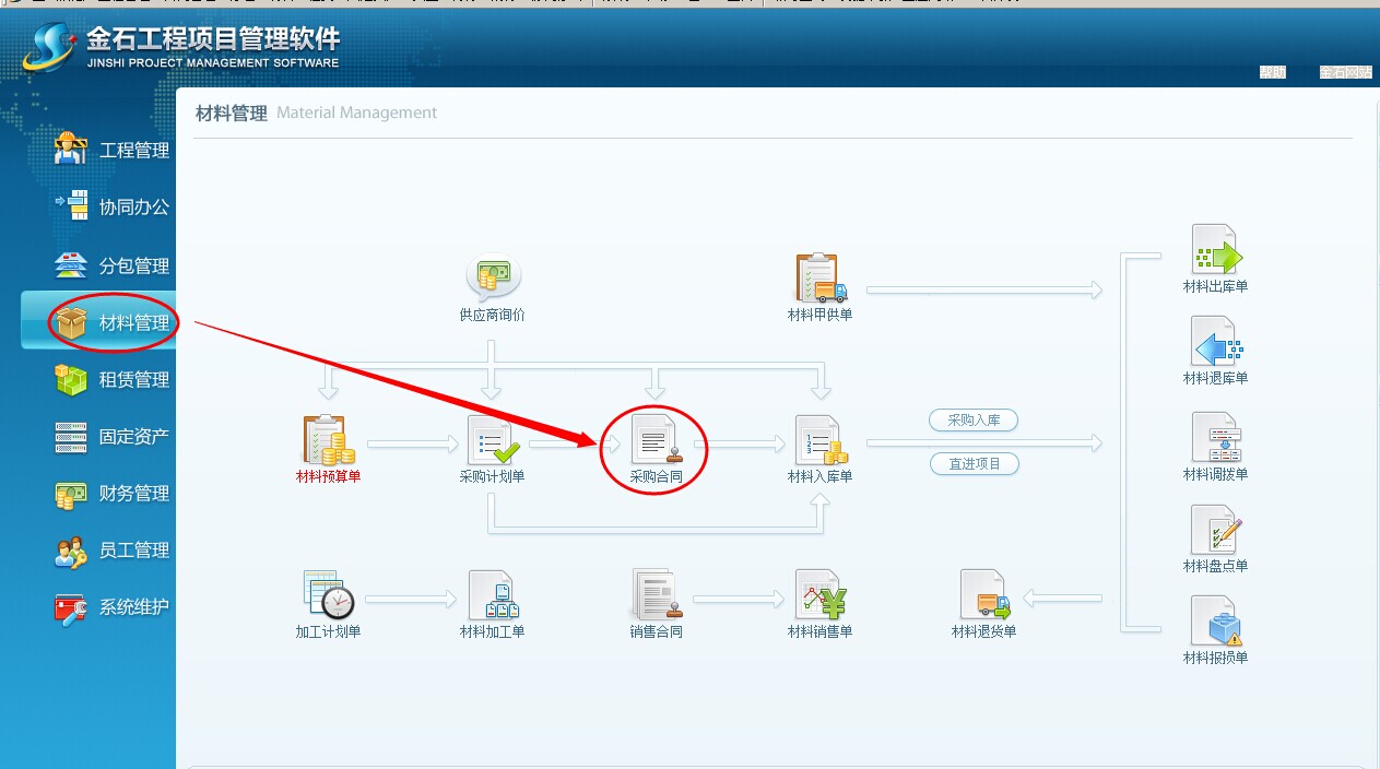 ①簽訂采購合同先付的預(yù)付款錄入:打開軟件導(dǎo)航欄材料管理-----采購合同