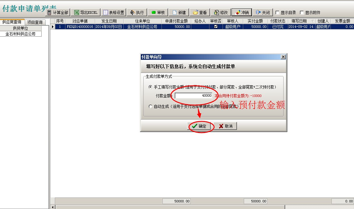 注:以上操作完成了預(yù)付款申請50000,付款50000。