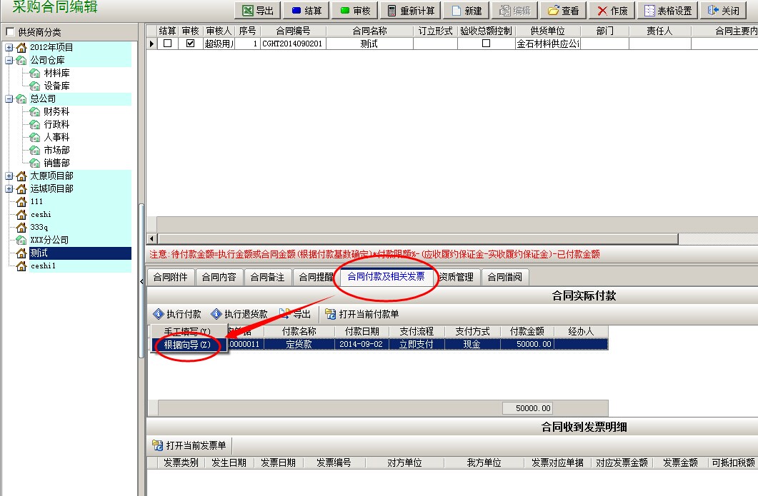 如果再有付款的情況,我們做【采購合同】->【合同付款及相關(guān)發(fā)票】->【到貨驗(yàn)收】->【合同付款】->【根據(jù)向?qū)А俊?/span>