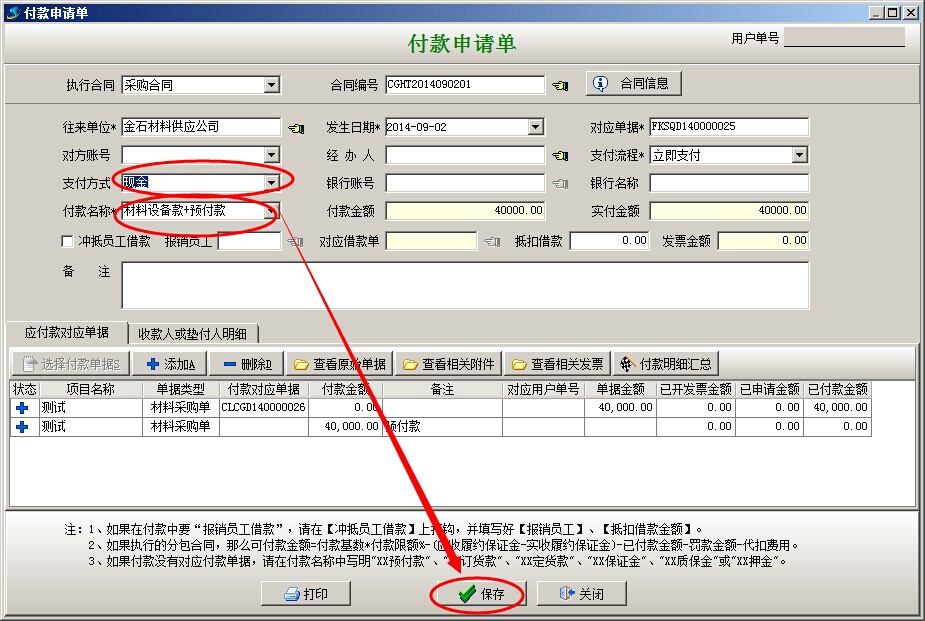 注:上圖所示;付款申請單的兩行明細(xì)為兩個(gè)材料采購單,第一行的[付款對應(yīng)單據(jù)]為CLCGD140000026已付款金額40000已經(jīng)等于單據(jù)金額(表示該采購單已經(jīng)付完,是通過上一個(gè)付款單自動(dòng)對應(yīng)上的付款數(shù)),所以付款金額為0,第二行的[付款對應(yīng)單據(jù)]為空,表示本項(xiàng)支付的款項(xiàng)為預(yù)付款),上面的付款名稱為材料設(shè)備款+預(yù)付款;