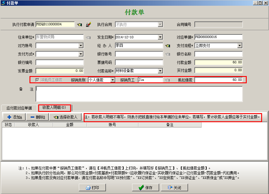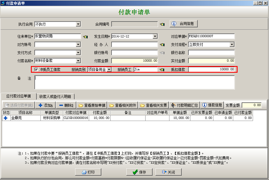 (2)本情況和(一、員工墊付)情況比較中多了前期借款步驟、后期還款步驟。中間的報銷環節基本一樣,區別在【付款申請單】和【付款單】中要選中“沖抵員工借款”選項,報銷類別選擇“個人借款”,不需要填寫“收款人明細欄目”如下圖: