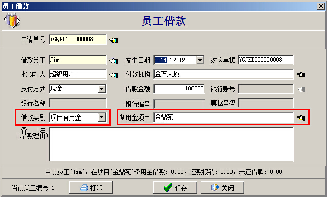 (1)本解決方案基本上和情況二類似,區別在于員工請款單、員工借款單的[借款類別]要為“項目備用金”,如下圖: