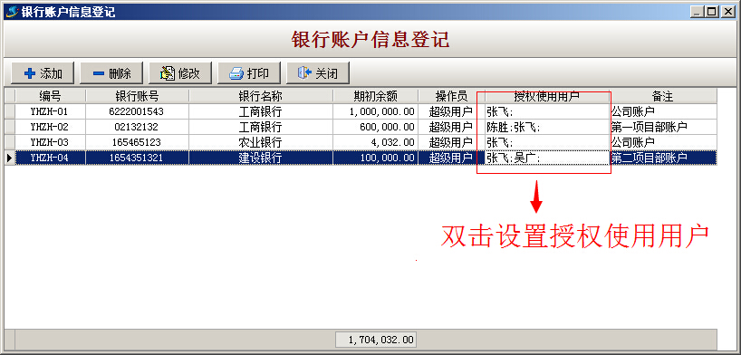 (2)讓超級用戶或總公司財務經理在期初使用軟件時,在軟件的主菜單中【財務】->【銀行管理】->【銀行賬戶信息登記】中建立總公司賬戶和項目部(或子公司)賬戶,其中總公司銀行賬戶的授權使用人要設置為總公司的相關財務人員和總經理,項目部(或子公司)賬戶的授權使用人要設置為總公司和該項目部(或子公司)的相關財務人員和經理,這樣總公司人員不但能查詢總公司的銀行資金流水還能監控到各項目部的流水,項目部(或子公司)只能查看自己的資金流水。如下圖:
