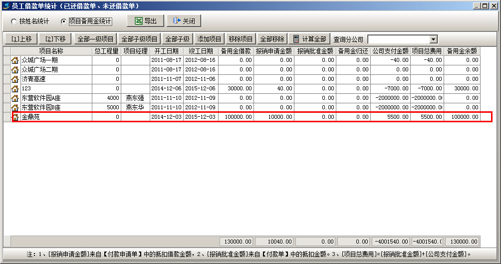支付完成之后可在“員工借款統計”-“項目備用金統計”查看到對應的項目備用金及報銷金額的匯總。