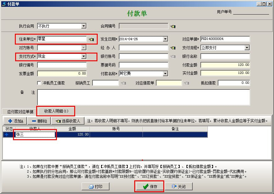 (5)因為錢是直接給的員工,所以在做【付款申請單】或【付款單】時,注意“收款人明細”中寫名收款為墊付的員工。往來單位要寫明真實單位,如果是不具名的單位,可以提前在基礎信息的【往來單位維護】中添加一個名稱為“零星”的單位,統一處理類似費用的支出。如下圖: