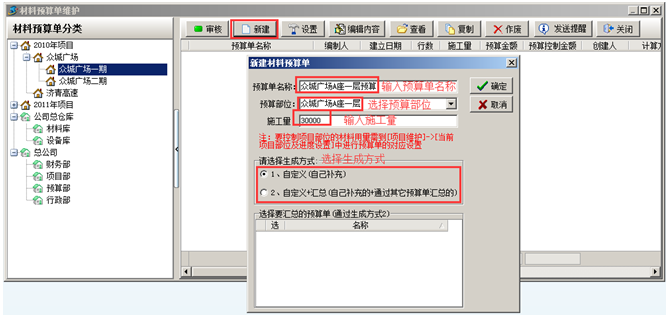 編輯材料預(yù)算單的基本信息,基本信息輸入完成之后點(diǎn)擊[確定]的按鈕,彈出“設(shè)置完成”的提示,如圖: