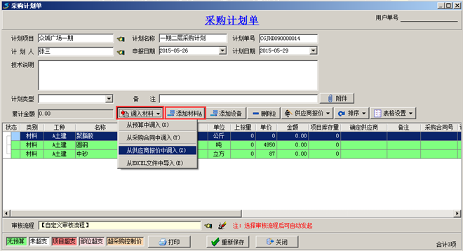 “采購計劃單”添加完成,則添加“采購入庫單”進行采購入庫,采購入庫。在添加“材料采購單”基礎信息時,選擇“采購計劃單”,并調入計劃單中的材料。如圖: