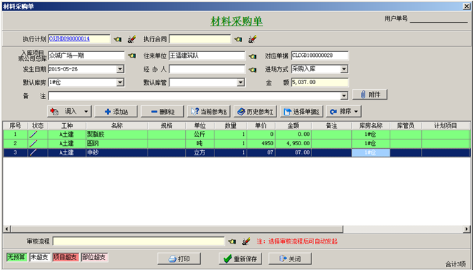 材料調入到材料采購單中之后,執行工程項目材料采購流程。具體執行工程項目材料采購流程參照第一種情況,如圖: