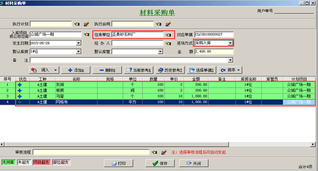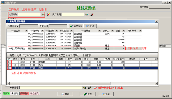 第四步,材料到貨之后,可在【材料管理】模塊,做“材料采購單”,選擇材料的時候,選擇“執行合同”,在合同明細里面添加到貨內容。如圖: