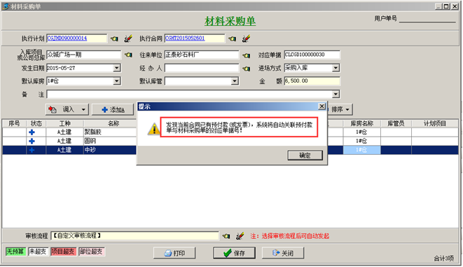 工地現場材料管理過程中,材料到貨之后,可以做采購入庫單(材料驗收單)執行驗收入庫(或直進項目)?;蛟凇昂贤瑑热荨崩锩妫c擊[到貨驗收],在彈出“采購入庫單”(材料驗收單),在單據中輸入“驗收數量”,保存時系統會提示自動關聯第一次預付款,“確定”之后保存,如圖: