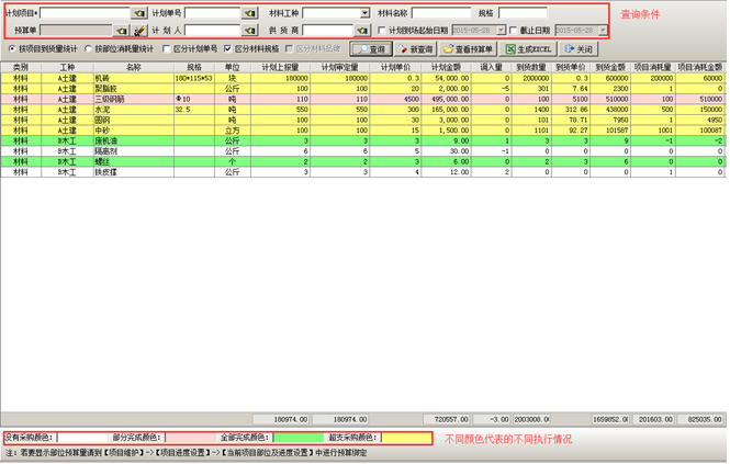 如果要查看材料采購的執行情況,可進入到[采購計劃執行查詢]里面按照查詢條件進行查詢??筛鶕牧巷@示的不同的顏色看出材料的采購計劃執行情況,如圖: