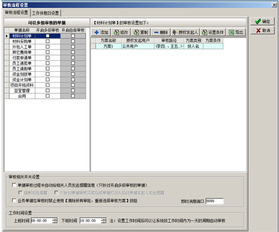 1、先由系統管理員設置好每個審核方案的每個審核級別的審核周期(如1天,2天,1個工作日,2個工作日等)、并設置好每天的上班時間 和下班時間。如早8:00 到下午18:00。