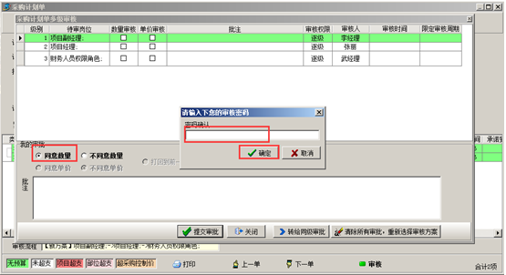 審核人審核時,選擇“我的審核”的選項,并輸入審核密碼,點擊“確定”按鈕,選擇下一位審核人,此時單據的審核狀態是“審核中”,如圖所示: