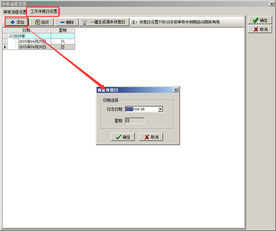 在系統中設置工作休息日,“一鍵生成周末休息日”,系統在跳轉審核時不會在休息日內跳轉,如圖: