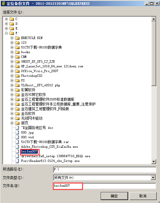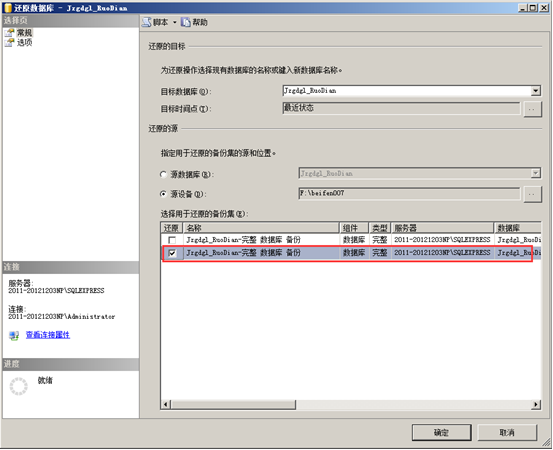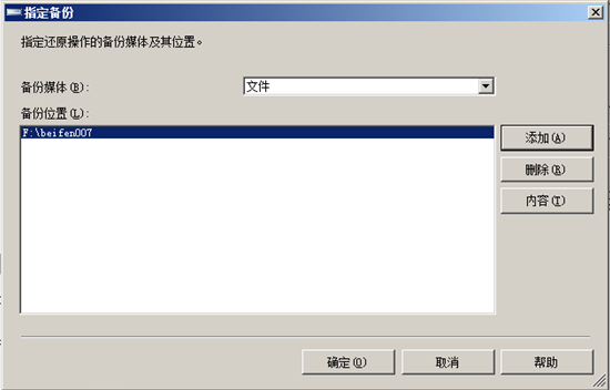 進入“指定備份對話框”,點擊“添加”,進入指定數(shù)據(jù)庫文件窗口,瀏覽并找到需要還原的數(shù)據(jù)庫備份文件,點擊“確定”, 點擊“確定”后回到指“定備份”對話框,此時需要還原的文件已經列出來了,接著點擊“確定”,返回“還原數(shù)據(jù)庫”。如圖: