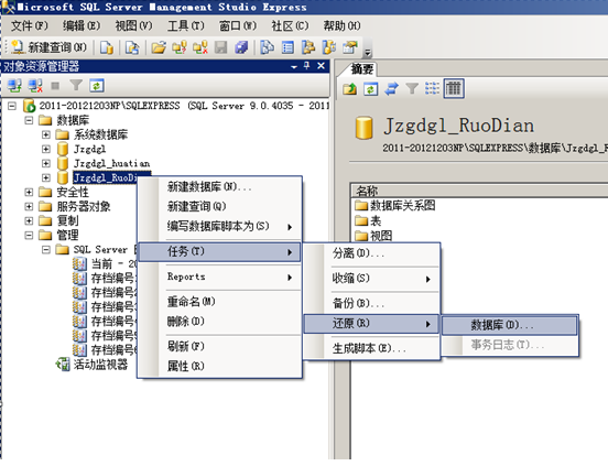 Sql2005數(shù)據(jù)還原時,在“開始”-“程序”進入資源管理器,登錄需要備份的數(shù)據(jù)庫服務器,打開企業(yè)管理器后,逐一展開,看到有數(shù)據(jù)庫項后,選中數(shù)據(jù)庫節(jié)點單擊右鍵,選擇“任務”-“還原”-“數(shù)據(jù)庫”,如圖: