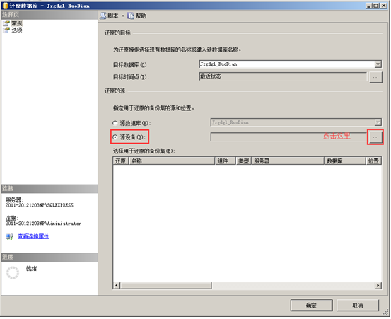 選擇“還原”后進入“還原數(shù)據(jù)庫”窗口,目標數(shù)據(jù)庫默認已經選擇需要還原的數(shù)據(jù),接著在“還原的源”中的選擇“源設備(D)”,單擊“源設備((D)”右邊的“…”按鈕,如圖: