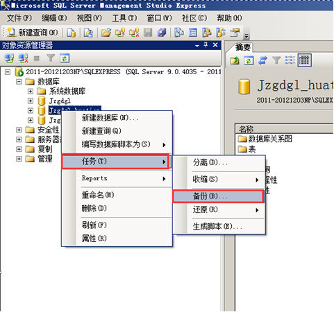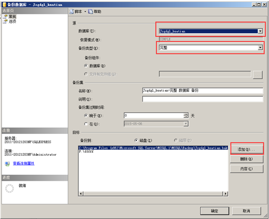 在“對象資源管理器”找到想要進行備份的數(shù)據(jù),選中點擊鼠標右鍵,點擊“任務”-“備份”,彈出“備份數(shù)據(jù)庫”的對話框,備份類型選擇“完整”,“目標”是備份文件的位置,可以自定義一個比較好找的目標,這樣備份以后就可以方便的找到備份文件了,設置完成點“確定”即可,然后到目標目錄下找到備份文件就是所需的備份文件,如圖: