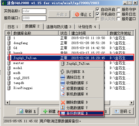 Sql2000數(shù)據(jù)備份時,在電腦的右下角點擊迷你sql的圖標彈出迷你SQL2000的對話框,選中要備份的數(shù)據(jù)庫名稱。點擊鼠標右鍵選在“備份數(shù)據(jù)庫”,彈出“另存為”的對話框,選擇備份文件保存的地址,輸入備份文件的名字,然后點擊“保存”的按鈕,如圖: