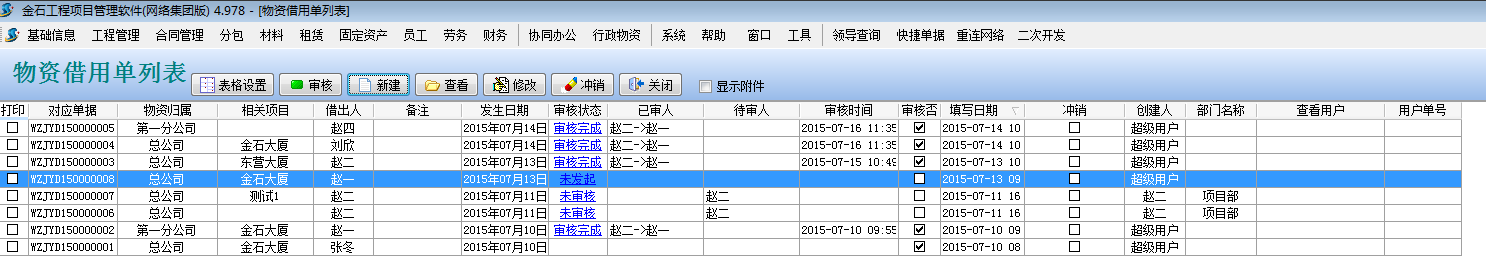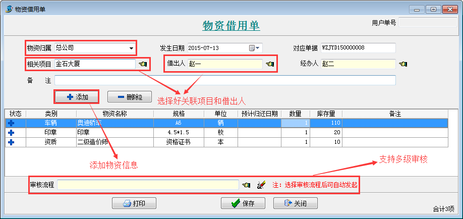 點擊主菜單中的【行政物資】->【物資借用單】打開物資借用單列表 點【新建】按鈕,錄入如下: