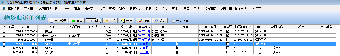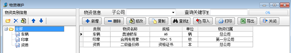 工程項目物資管理可用于管理車輛,印章,證書,資質,設備,辦公用品等物資的入庫,報損,借用,歸還等過程。錄入相關單據前,需先錄入要用到的基礎信息中的【物資維護】【子公司信息維護】。