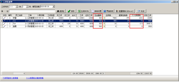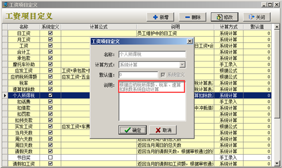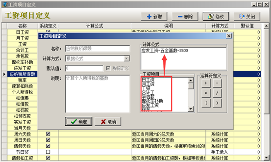 工程項(xiàng)目管理軟件中“五金基數(shù)”及“個(gè)人所得稅”在工資項(xiàng)目定義中設(shè)置好之后,在生成工資表時(shí)系統(tǒng)會(huì)扣除對(duì)應(yīng)金額。如圖: