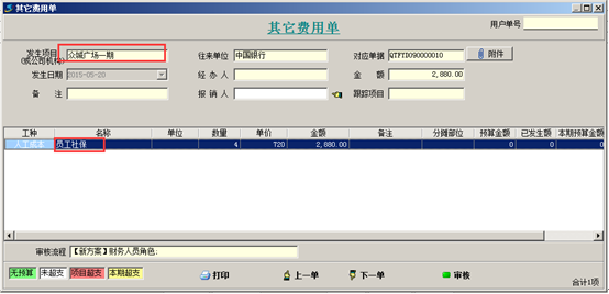 工程項(xiàng)目管理軟件中如果公司將“社保金額”以及員工“個(gè)人所得稅”計(jì)入項(xiàng)目成本,則須在系統(tǒng)中將“社保金額”(包括員工自己繳納以及公司繳納的)以及“個(gè)人所得稅”做其他費(fèi)用單,計(jì)入項(xiàng)目成本中。如圖: