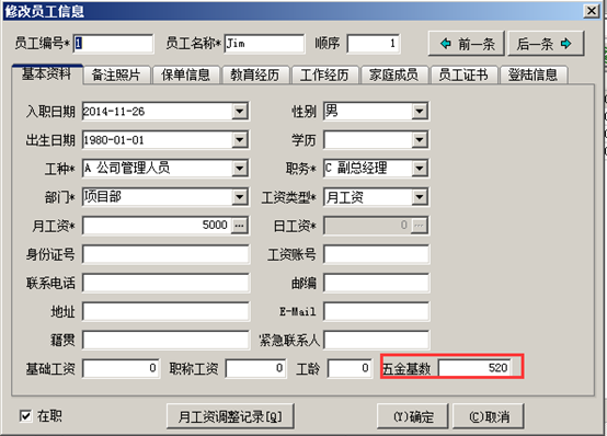 在工程項(xiàng)目管理軟件中生成工資表之前需要在員工維護(hù)里面設(shè)置好員工的“五金基數(shù)”,如圖:
