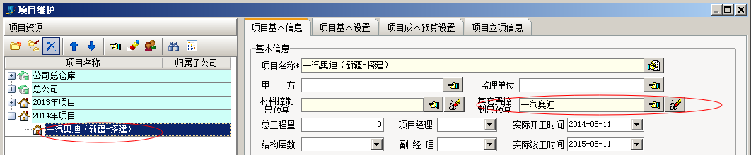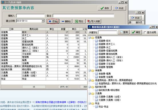 在預算單中,點【添加】按鈕就會彈出之前設定好的科目,以供我們選擇使用。添加完成后,點保存按鈕進行保存。保存完成后,我們可以在工程管理模塊【項目維護】中進行預算與項目綁定。