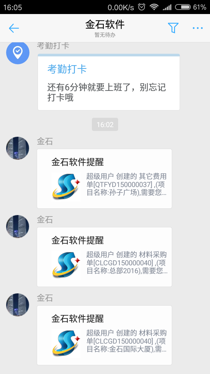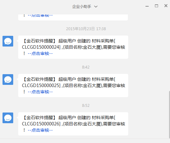 用超級用戶設置好微信認證之后在,當單據創建人發起審核后,審核過程中的人都會收到微信提醒信息。微信如下圖:
