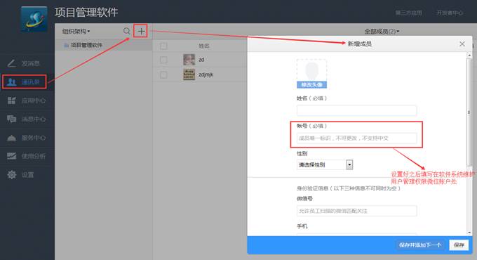 ⑵ 在微信企業(yè)號(hào)界面通訊錄模塊添加成員。如下圖: