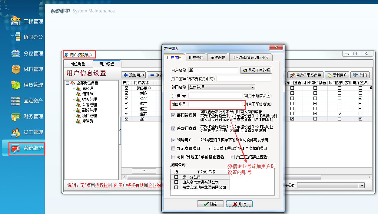 ⑶ 在金石軟件【系統(tǒng)維護(hù)】-【用戶管理權(quán)限設(shè)置】中設(shè)置每個(gè)使用用戶的微信賬號(hào)。如下圖: