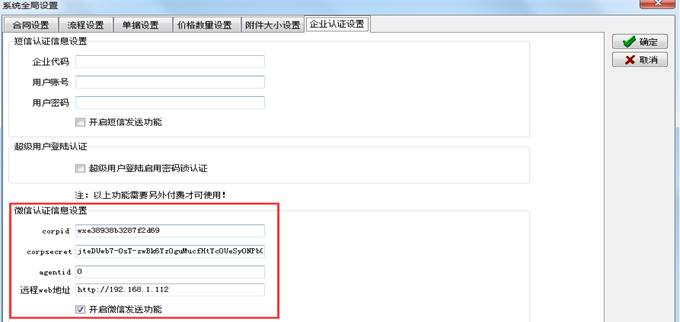 4. 獲取corpid, corpsecret和agentid好后登陸超級(jí)用戶在【系統(tǒng)維護(hù)】-【系統(tǒng)全局設(shè)置】-【企業(yè)認(rèn)證設(shè)置】填寫微信認(rèn)證信息。(此處需要開發(fā)商授權(quán))