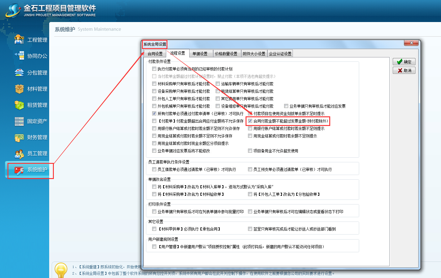 在【系統維護】-【系統全局設置】可以設置合同付款金額不能超過發票金額(預付款除外),如下圖: