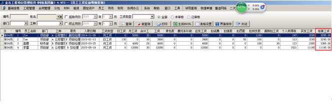 工程管理軟件工資表生成之后員工在不同項目上出勤的工資會生成到同一張工資表中,如圖: