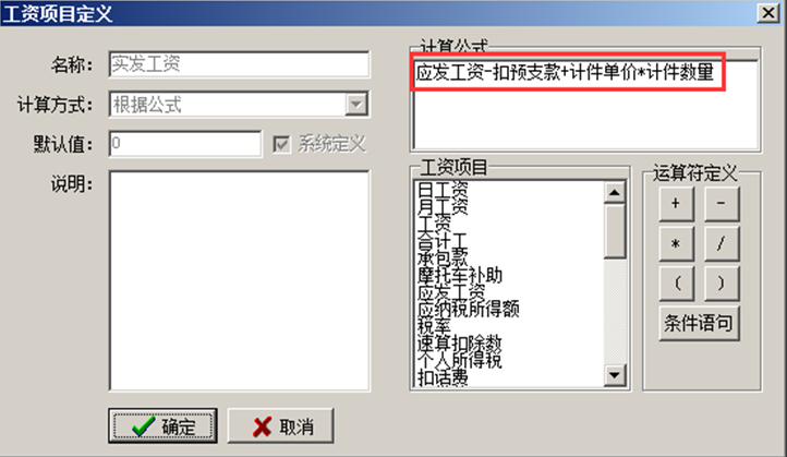 注:若在請假單或加班單中直接手動輸入請假扣工資或加班工資,在工資項目定義中直接帶入請假扣工資或加班工資,則無需定義相關公式。