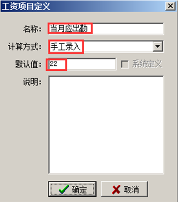 1、先在工資項目定義中增加兩個科目:日單價工資,當月應出勤。如圖:
