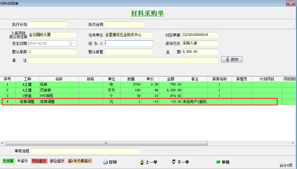 項目管理軟件設置結算調整金額時調增錄入正數,調減錄入負數。供應商優惠10元則輸入-10,點擊確定調整完畢,此時材料采購單金額變為9900元。點擊查看,此時會發現材料采購單會多出一個結算調整的材料明細。如下圖: