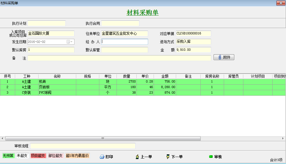 我們以項目管理軟件材料采購單為例,如圖新建一個材料采購單。