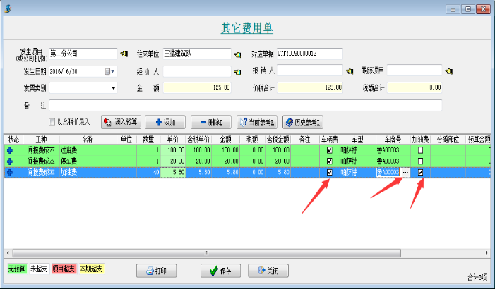 登記車輛日常費用時,[車輛費]、[車型]、[車牌號]為必選項,如果為這項費用為“加油費”,則需要在[加油費]上打鉤。